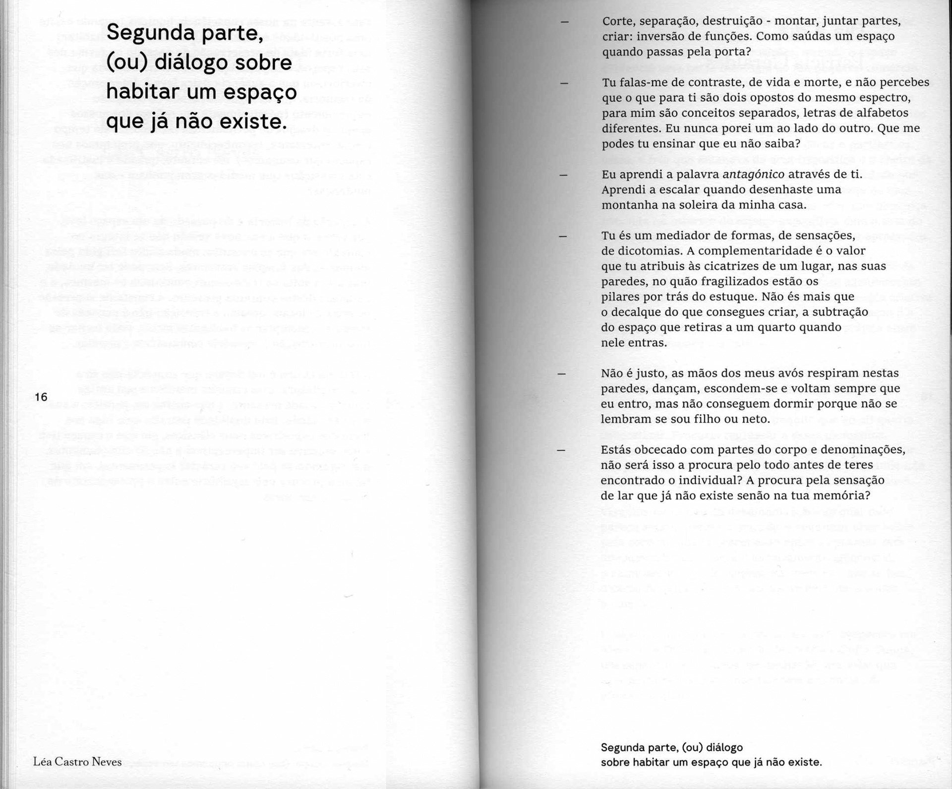 - You are a mediator of forms, of sensations, of dichotomies. Complementarity is the value you attribute to the scars of a place, on its walls, in how fragile the pillars behind the plaster are. You are nothing more than the imprint of what you can create, the subtraction of the space you take away from a room when you enter it.